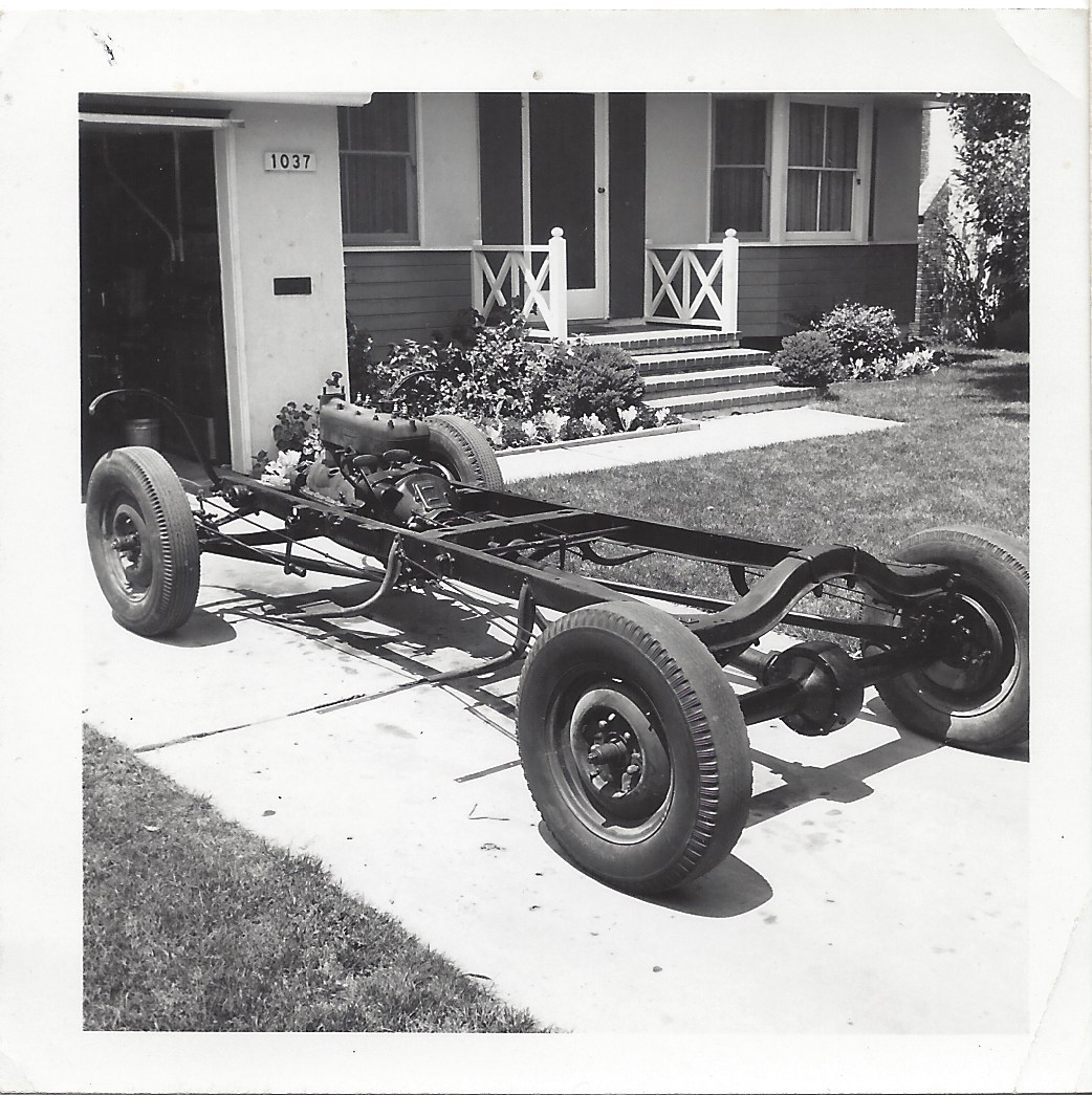 Noting that the garage door is open in this picture, either the chassis has just been rolled out of the garage or it is just going in. If it’s been inside the garage, this may be a photograph marking the first day when a mechanic is ready to begin her work on the jalopy of her dreams. If it’s going into the garage — well, only the rarest of people would keep a bare chassis and minimal motor in her garage regardless, and this is surely going to be worked on “soon,” in the optimistic sense of that well-used word.